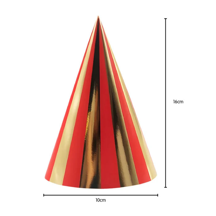 Pack of 6 Bright Red & Metallic Gold Striped Party Hats. Festive cardboard Birthday Party Hats.