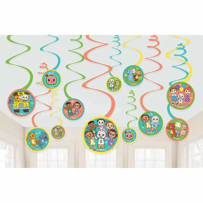 Pack of 12 CoComelon Swirl Decorations. Swirl decorations measure 60cm in length. Cutouts measure 13cm in diameter. Decorations are double-sided. Simply hang from your ceiling or outside on your pergola for an all adventure party setting!