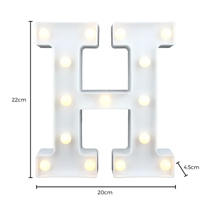 Plastic letter H measures 22cm tall x 20cm wide x 4.5cm deep.