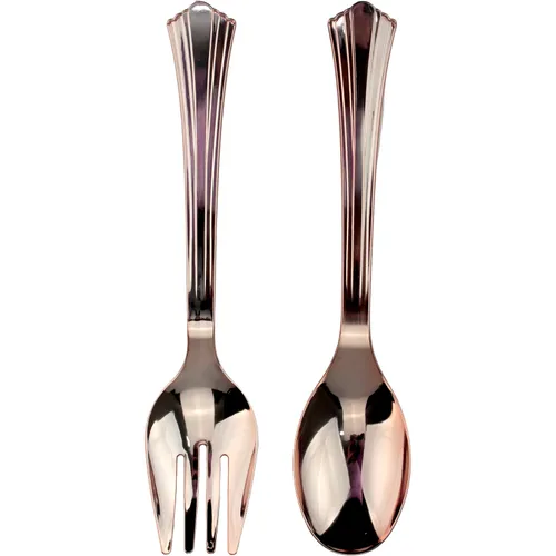 Rose Gold Plastic Salad Server Set. Reusable large serving spoon and fork, ideal for salads, pasta and vegetables.