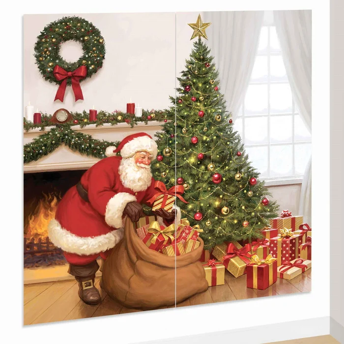 Display this timeless wall decoration showing a traditional scene of Santa Claus delivering presents by the tree on Christmas Eve. This beautiful scene setter makes a warm and welcoming backdrop for your Christmas Day celebrations.